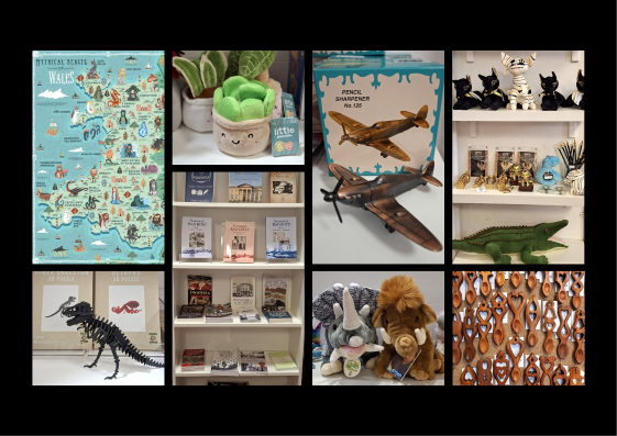 Mae siop anrhegion yr amgueddfa’n cynnig detholiad o eitemau sy’n ymwneud â chasgliad yr amgueddfa. Mae gennym ffigurynnau o dduwiau a brenhinoedd sydd wedi’u hysbrydoli gan ein casgliad Eifftoleg, a gallwch hyd yn oed prynu tegan meddal hipopotamws o afon Nîl i fynd ag ef adref gyda chi.